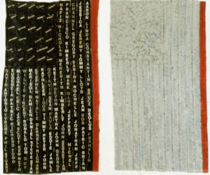 “So Howardena Pindell wants to talk about apartheid, but she doesn’t do it really loudly right?” Thrush said. “A work like this is really subtle. And in fact, when you see something like this, you have to move in really close to even be able to see that there are words on here . . . The words are things like malnutrition, death, torture . . . she is very subtly and in a very personal way making clear her feelings about apartheid.”
