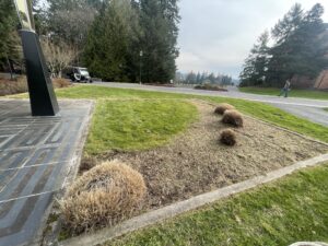 Standing atop a concrete pad at the intersection of three main walking paths outside the Firstenburg Student Commons stands a tall golden sculpture. Next to the concrete pad, a simple plant bed with a few bushes curves around a grass patch in the shape of the Fibonacci spiral.