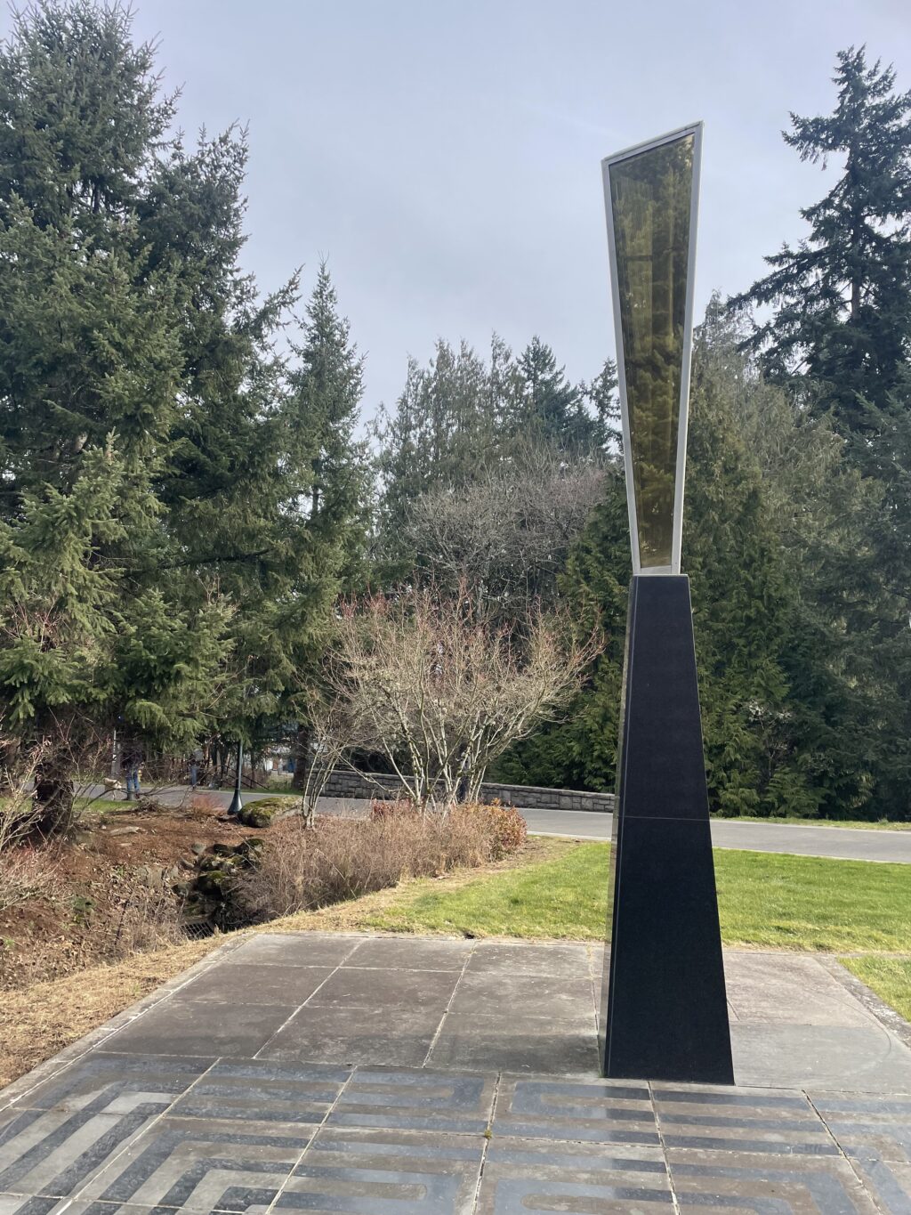 On the concrete pad below, an inscribed labyrinth pattern covers the majority of the installation. Over the entire plaza, the Fibonacci spiral is etched, and at the labyrinth center, a swirling spiral. There is no plaque describing the artwork, resulting in a piece of art that draws more questions than answers.